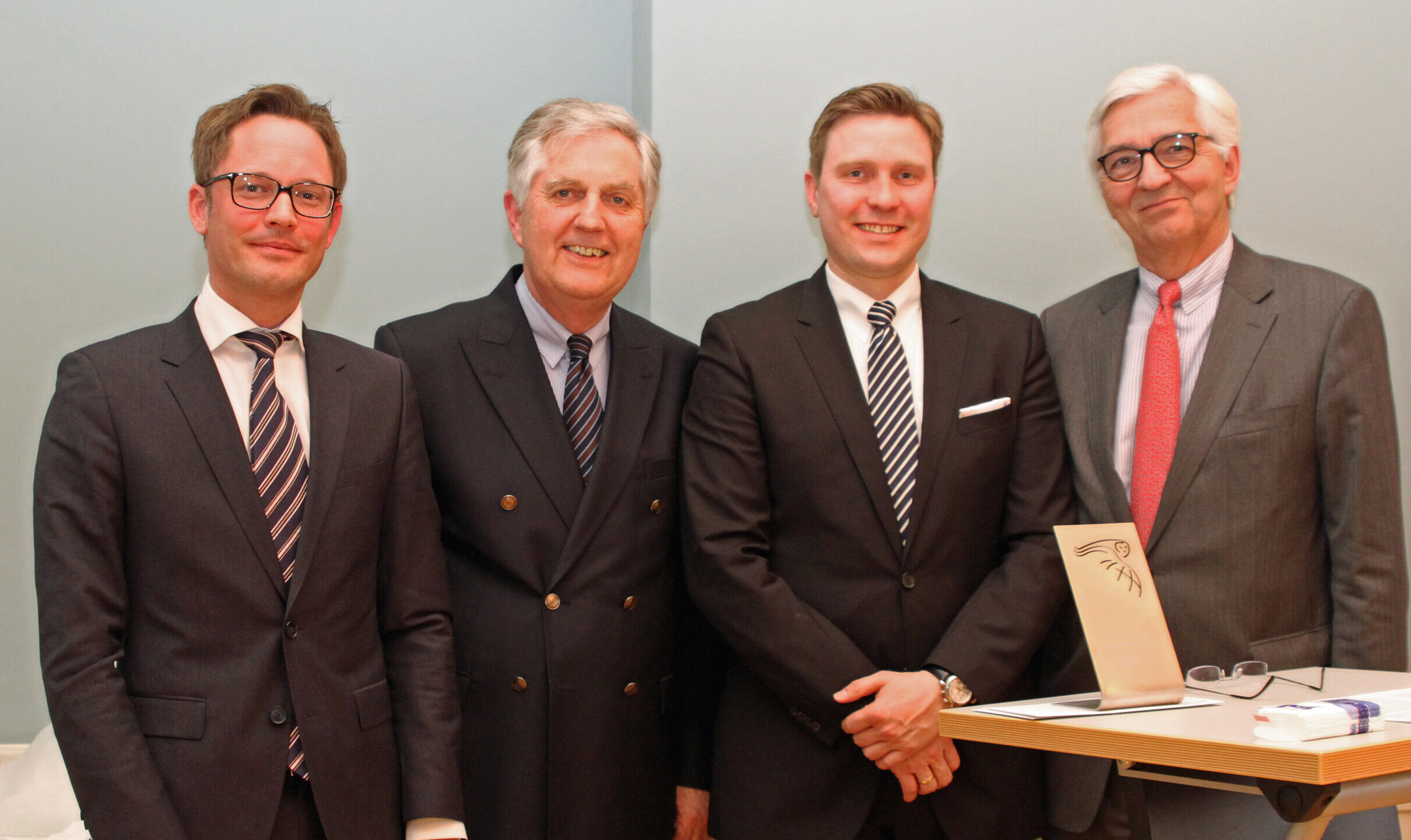 Bild: Dr. Jörg Stalleiken (Laudator und Preisträger 2013), Prof. Ulf Pallme König, Dr. Sebastian Madeja, Eduard H. Dörrenberg (Präsident der Gesellschaft der Freunde und Förderer der Heinrich-Heine-Universität).